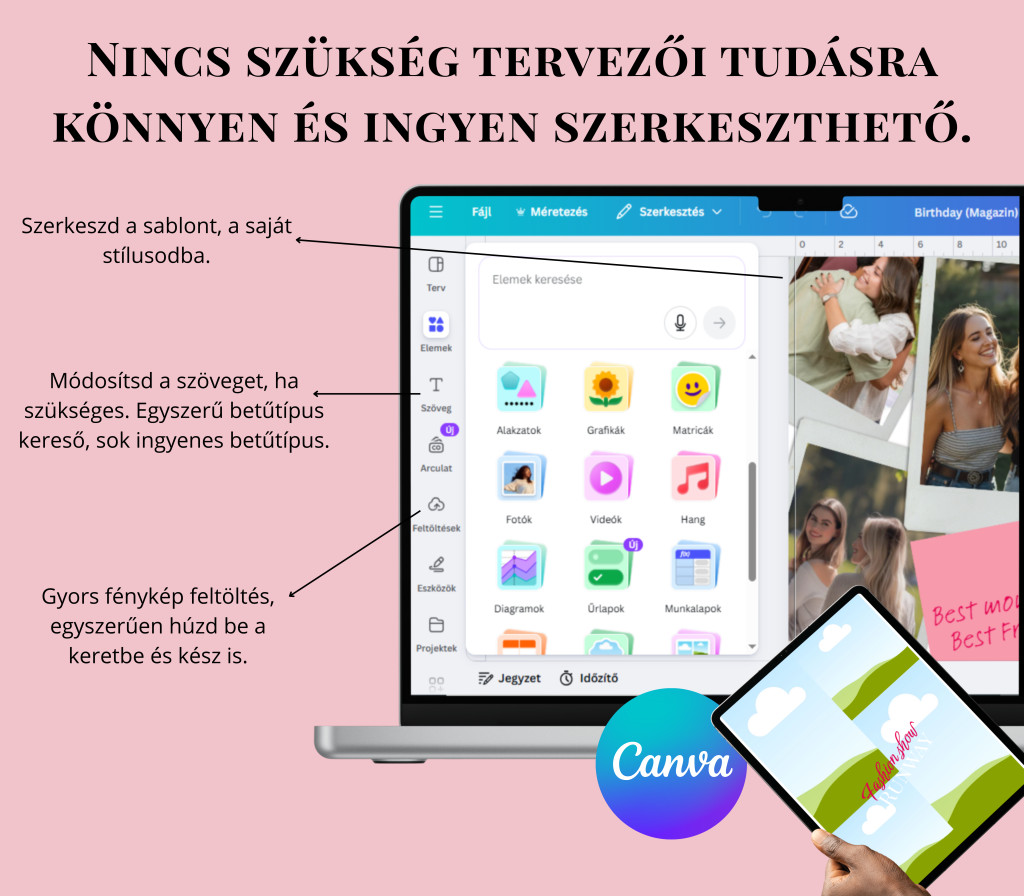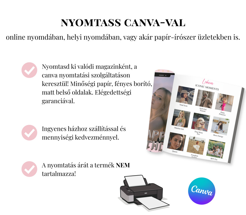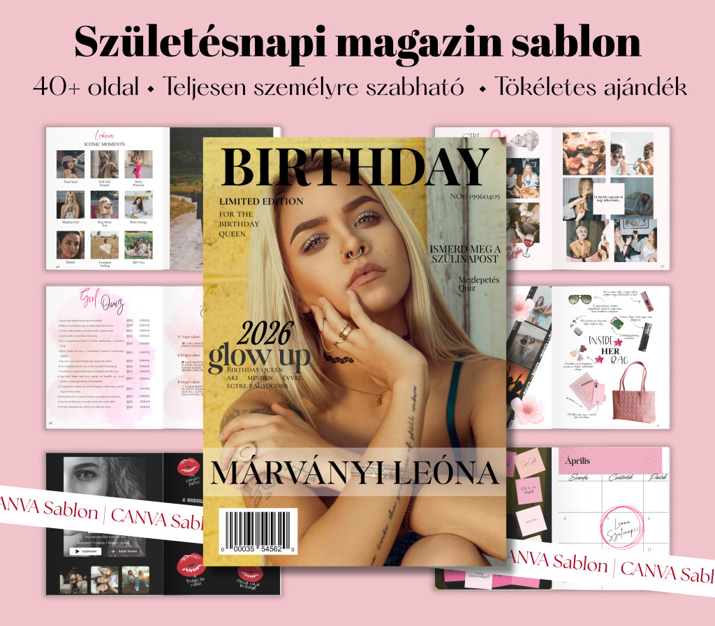 Profi design, nulla stressz: Nem kell grafikusnak lenned. Úgy terveztem meg a sablont, hogy az ingyenes Canva-val is olyan végeredményt kapj, mintha a legjobb barátnőddel egy prémium divatmagazin címlapján szerepelnétek.