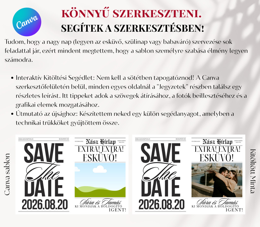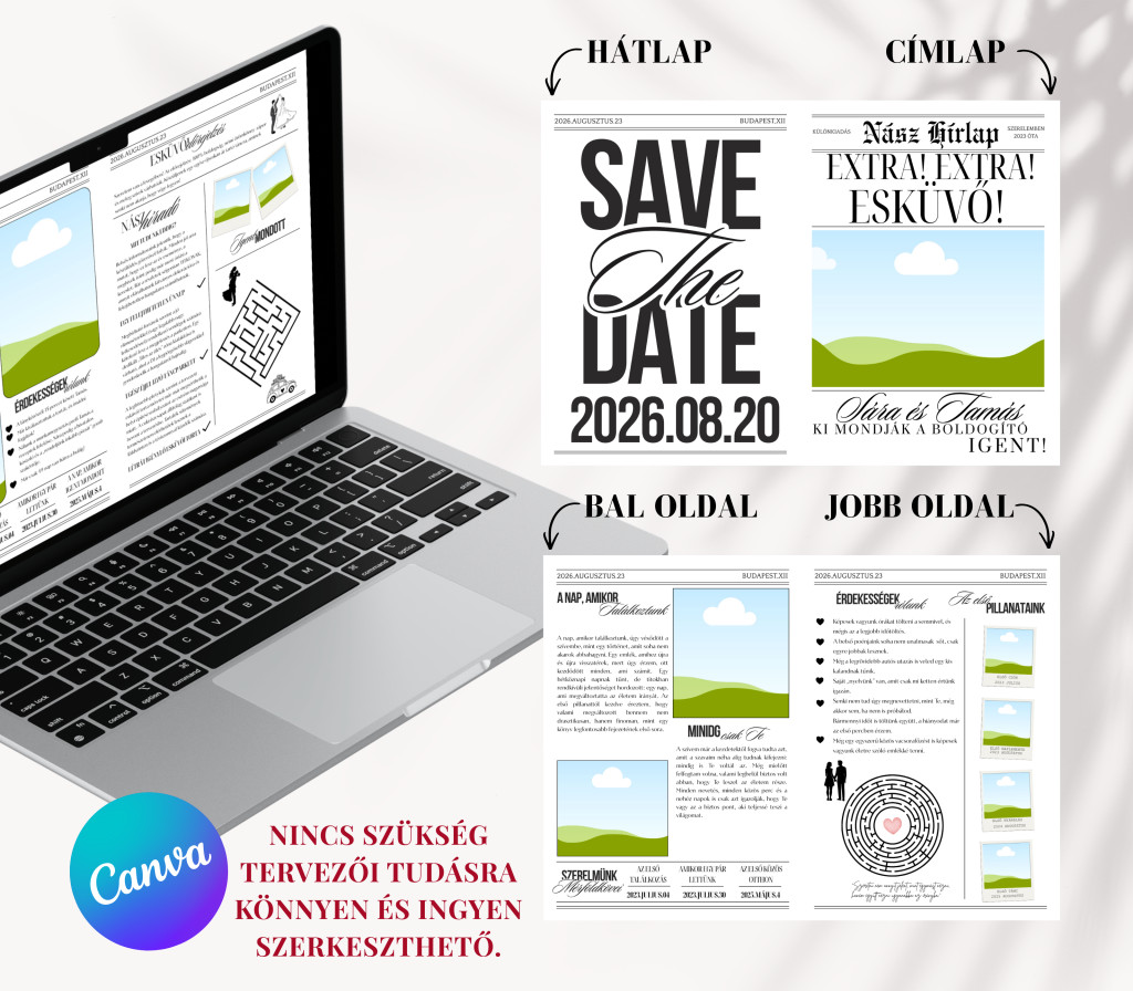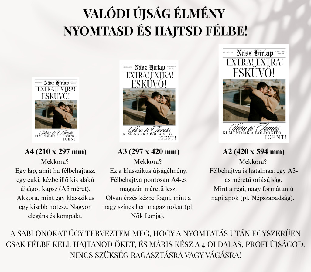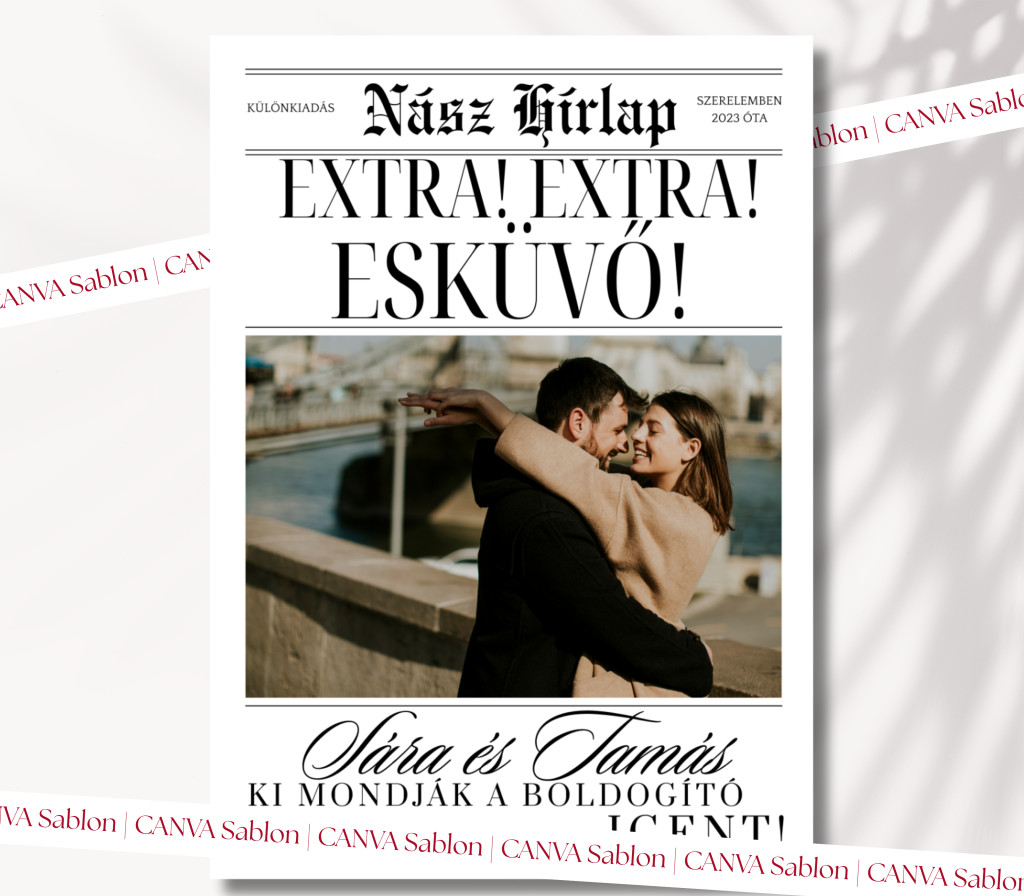 Szeretnétek valami emlékezetesebb módot az esküvőtök bejelentésére, mint egy sima üzenet? Ez az Esküvő Bejelentő Újság stílusos és különleges módja annak, hogy tudassátok a világgal: összeházasodtok!