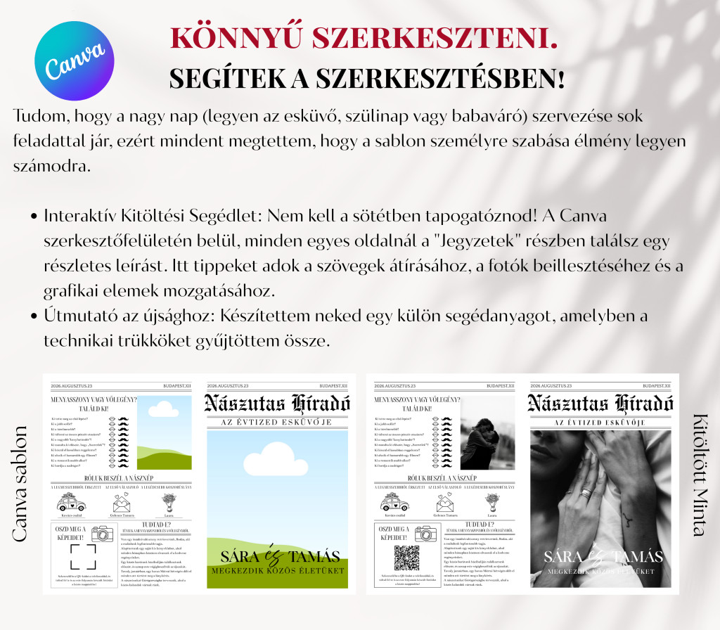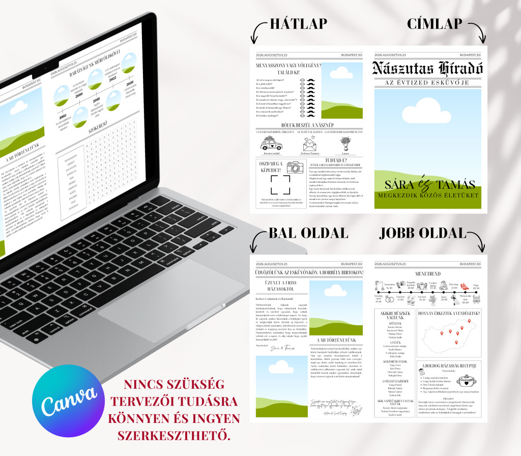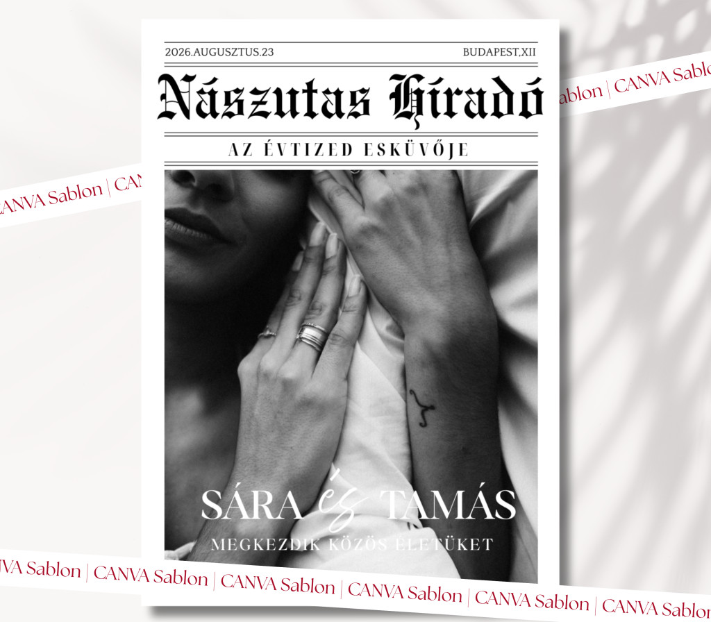 Szeretnétek valami olyat az asztalokra, ami nem csak dísz, de le is köti a násznépet? A Nászutas Híradó sablonunkkal egy igazi exkluzív magazint varázsolhattok a saját esküvőtökre.